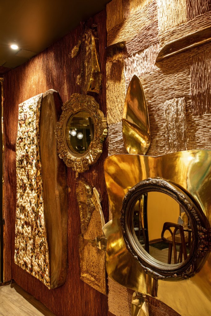 Picture a large, richly textured tapestry combined with ornate and modern mirrors arranged asymmetrically. The tapestry adds warmth and softness, while mirrors bounce light and create depth. Mixing shapes—round, oval, rectangular—adds movement and rhythm to the wall. The overall effect is eclectic, layered, and lively.