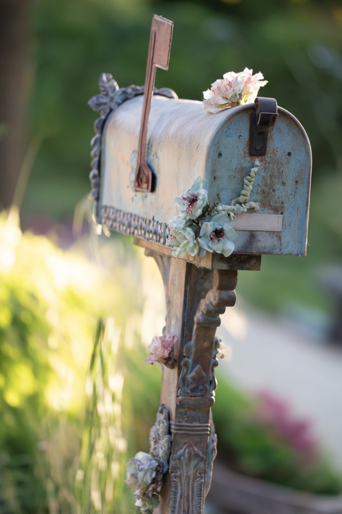 12. Quaint Mailbox Post with Vintage Details and Flower Accents