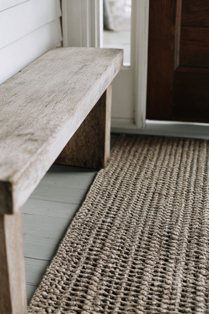 17. Cozy Entryway with Woven Doormat and Wooden Bench