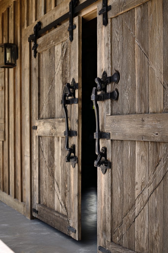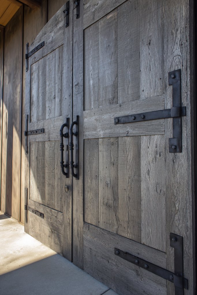 Visualize massive wooden doors with a rich, weathered finish, accented by matte black handles and hinges. The doors swing open to reveal a welcoming interior or porch area, hinting at cozy farmstead living. Their size and texture add depth to the facade, while the black hardware provides striking contrast. The overall effect is both bold and inviting.