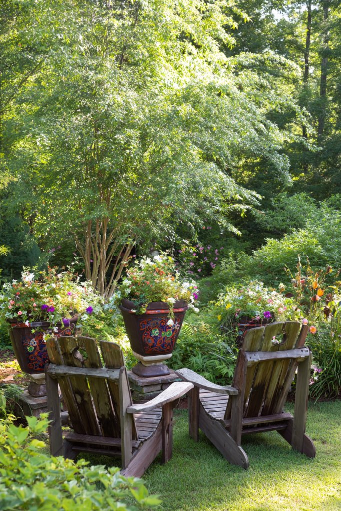 23. Small Garden Nook with Adirondack Chairs and Decorative Planters