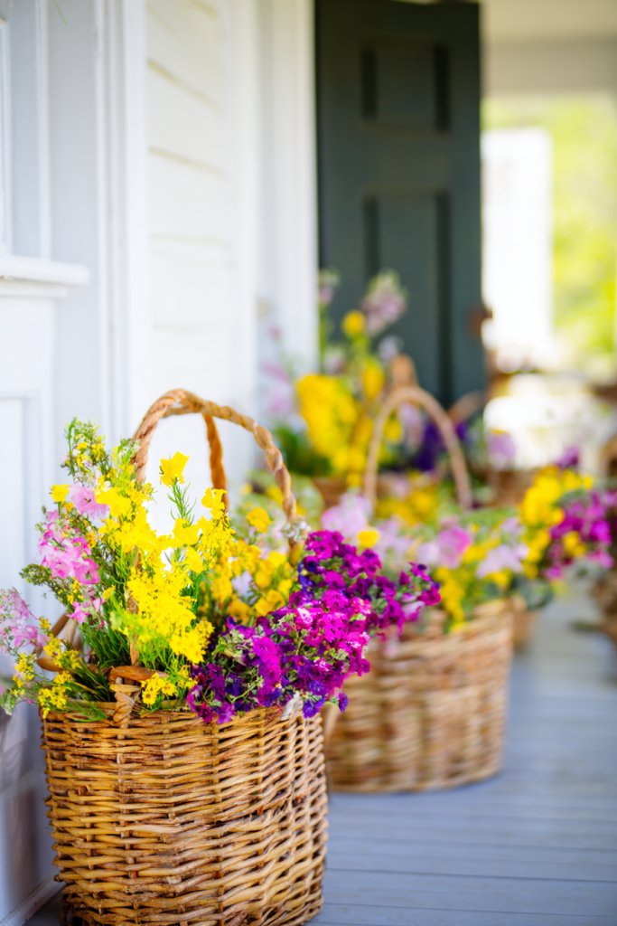 7. Wicker Baskets Filled with Seasonal Wildflowers on the Porch