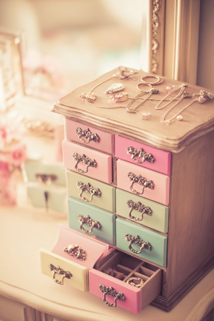 Mix open trays with closed boxes for a layered effect. Use wall-mounted hooks or pegboards with vintage hooks for necklaces and earrings—just avoid actual wall art. Incorporate decorative knobs or knobs with floral motifs on drawers or cabinets. Seasonal updates include swapping out old jewelry for new pieces or adding themed accents like faux pearls or beads.