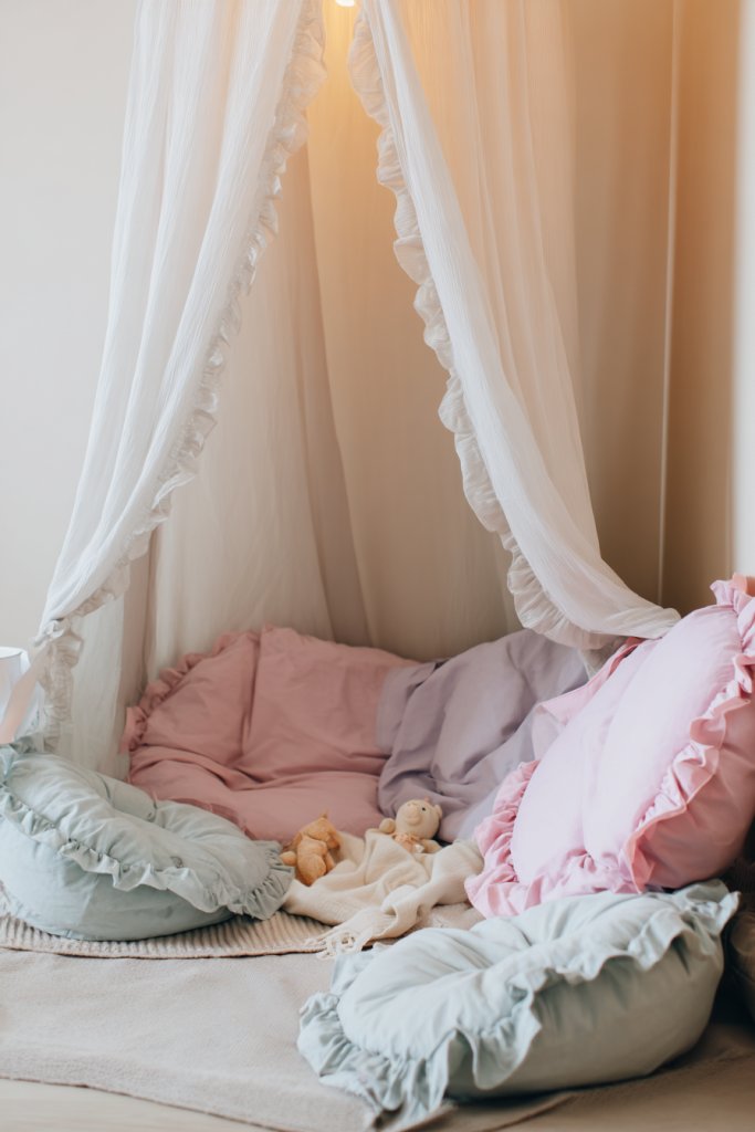 Imagine a corner draped with a light, sheer canopy in pastel pink or white, with an assortment of oversized cushions and plush throws on the floor. Fairy lights or string lights (see, avoiding restricted items) add a gentle glow. Decorate with textured rugs and soft fabrics to invite lounging. It’s a playful, inviting space where you can curl up with a book or daydream.