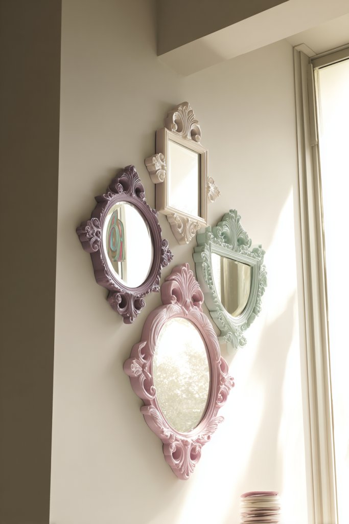 Imagine a cluster of small, ornate mirrors with pastel or metallic frames arranged artfully on a wall. Their reflective surfaces bounce light around, creating a lively, energetic atmosphere. The frames add a touch of elegance and personality—think vintage florals, scalloped edges, or pastel-painted wood. The overall effect transforms a dull corner into a captivating focal point.