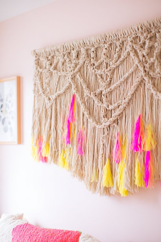 Imagine a large, intricate macramé piece in a vibrant color like coral or turquoise hanging above your bed or sofa. The knotted textures create a boho-chic vibe, adding layers of visual interest. Bright accents like beads or tassels can be woven into the cords, giving it a personalized pop of color. The overall effect feels artsy and warm, perfect for a relaxed, feminine space.