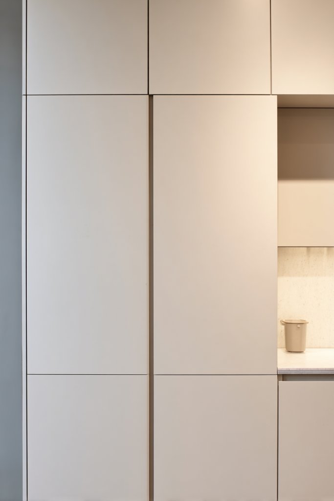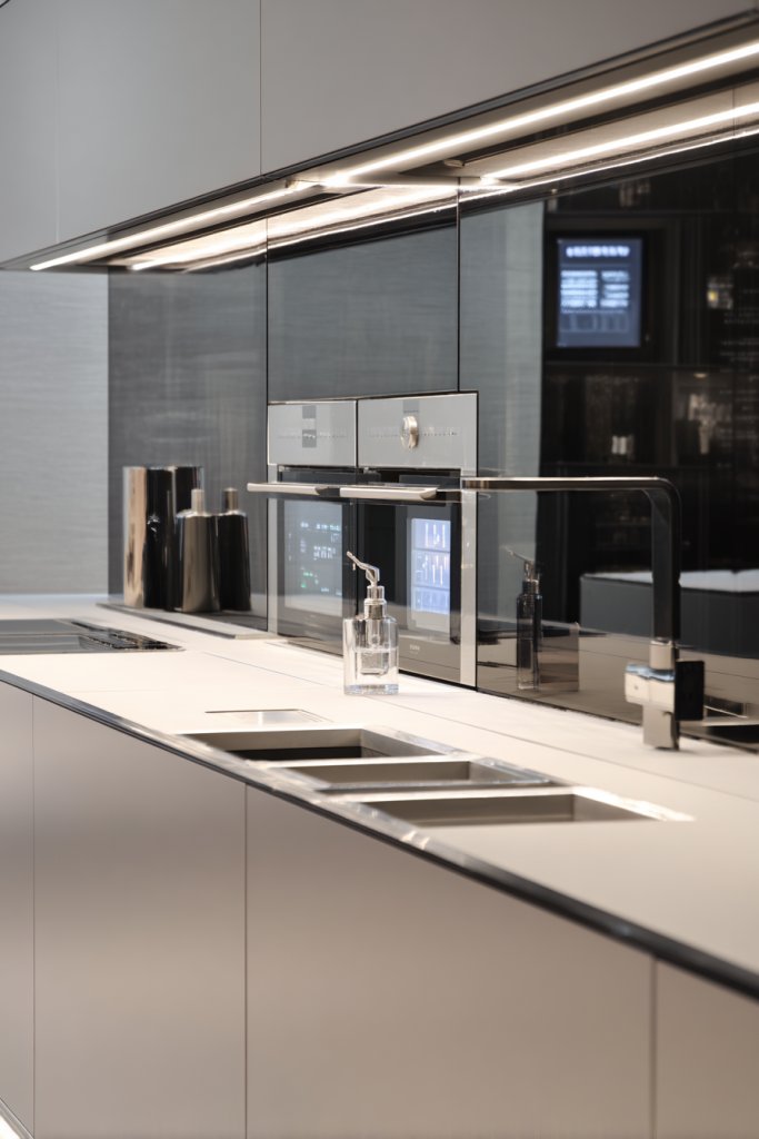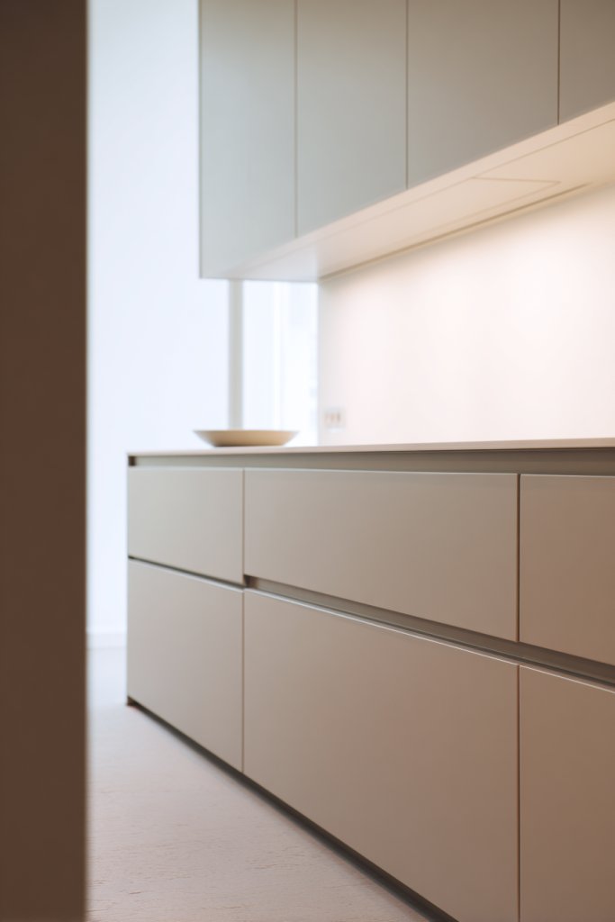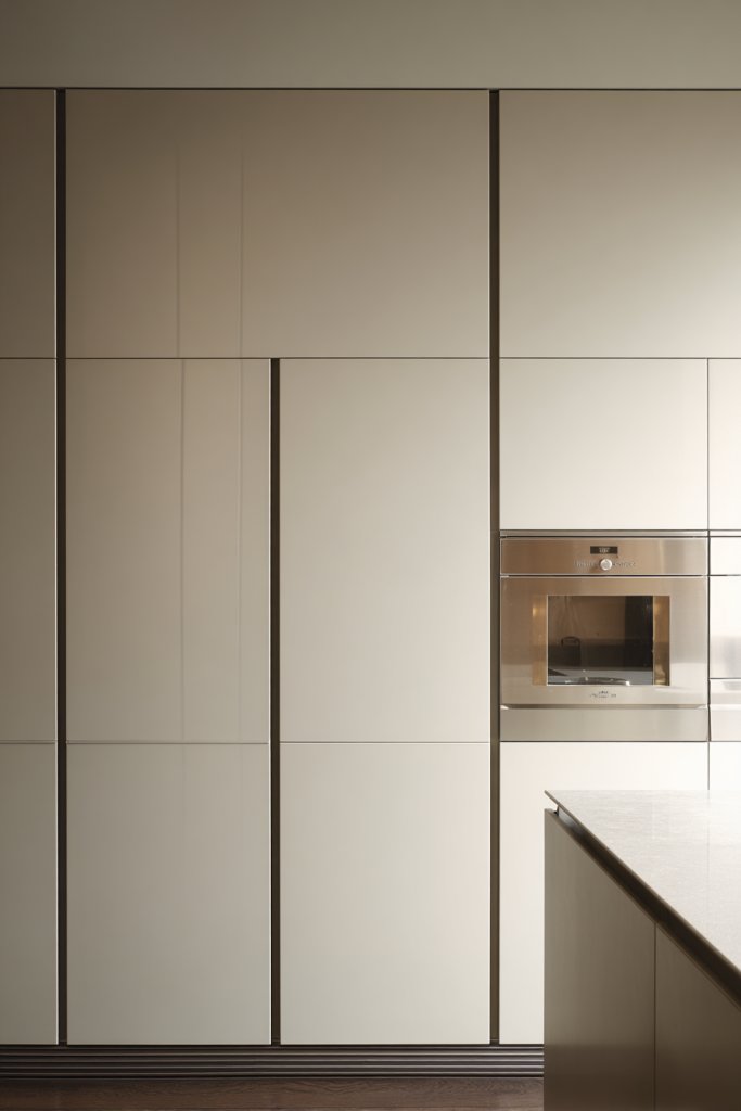 Imagine a kitchen with soft matte finishes in muted tones—perhaps a warm taupe or cool charcoal—stretching uninterrupted from wall to wall. The cabinets have a subtle push-to-open mechanism that keeps surfaces clean and free of hardware. Light bounces gently off these smooth surfaces, creating a calming, sophisticated environment. The overall effect feels like a boutique hotel suite, elegant yet understated.