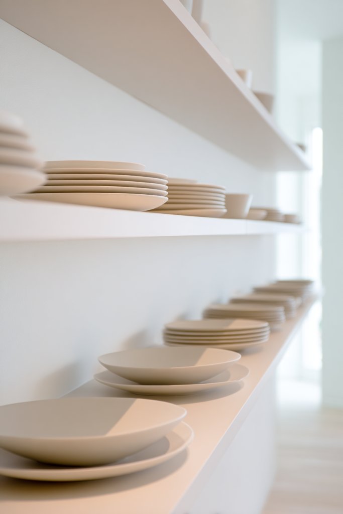 12. Open Shelving with Minimalist Dishware Display in Neutral Tones
