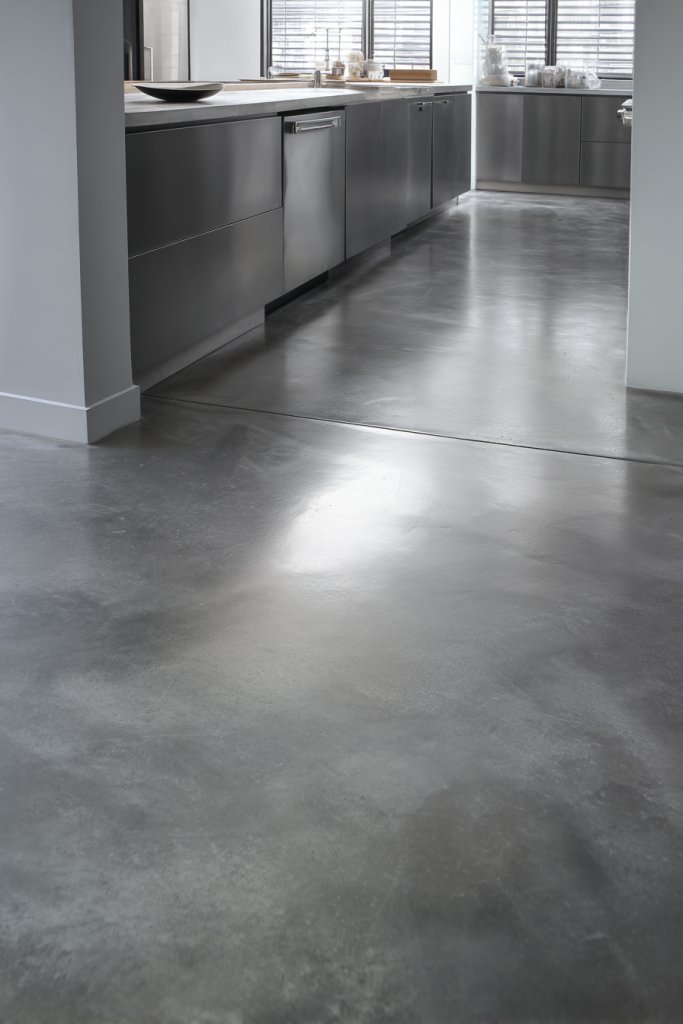 Imagine a smooth, glossy concrete or resin surface in a neutral gray or soft taupe, extending across the entire kitchen. The reflective finish enhances light, making the space feel larger and brighter. Subtle variations in texture and color add depth, while the minimal joints keep the look clean and uninterrupted. It’s like walking on a piece of modern art.