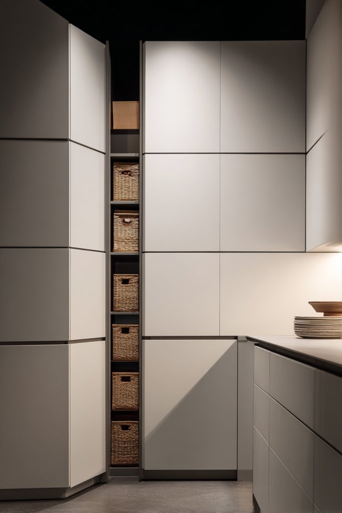 Imagine a sleek cabinet door that swings open to reveal a spacious, hidden bin system inside. The exterior matches your cabinetry, maintaining a uniform look. When closed, the space appears seamless, with no visible clutter or unsightly containers. It’s a smart, minimalist approach that keeps your kitchen looking pristine.