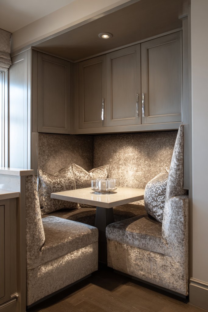 Picture a snug corner with a custom-built bench tailored to your space, upholstered in soft fabric or textured textiles. Complement it with a small table in marble or wood, and add cushions for extra comfort. The seating area is framed by sleek cabinetry or wall panels, creating a seamless, integrated look. Warm lighting from sconces or pendant lights completes the cozy vibe.