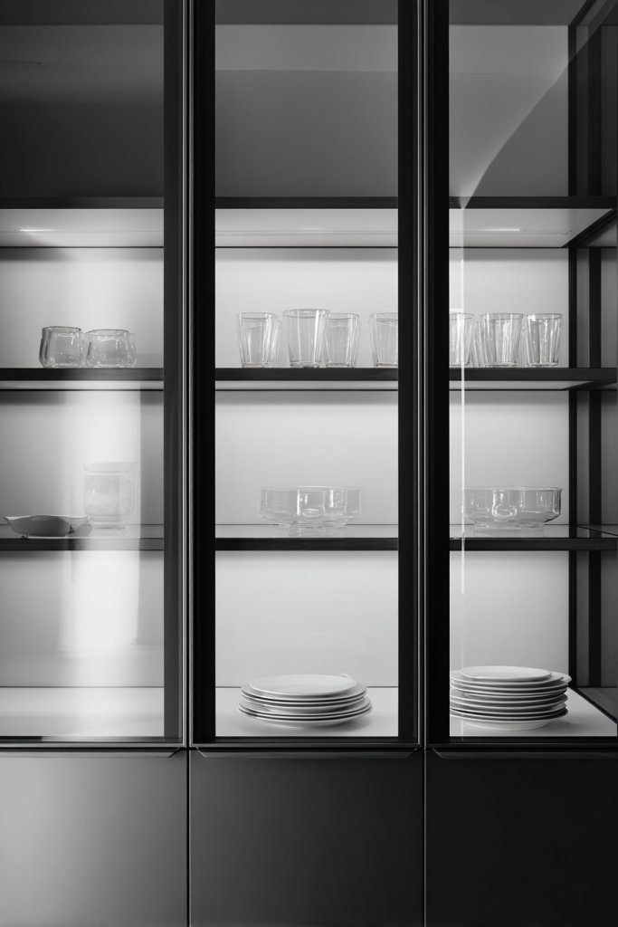 Visualize matte black or white frames enclosing clear glass panels—think minimalist, almost floating. The glass showcases neatly arranged dishware or glassware in neutral tones, adding a touch of glamour. The matte finish prevents fingerprints and glare, keeping the look pristine. The overall effect is airy, modern, and effortlessly chic.