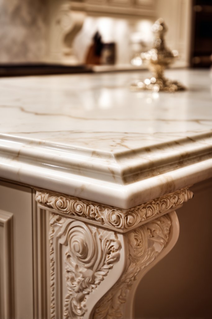 Picture a large island topped with polished marble or quartz in a striking pattern or bold color. The edge detailing—perhaps beveled, waterfall, or ogee—adds a sense of craftsmanship and finesse. The surface gleams under ambient lighting, creating reflections that add depth. It anchors the room with grandeur and elegance, elevating your entire kitchen.