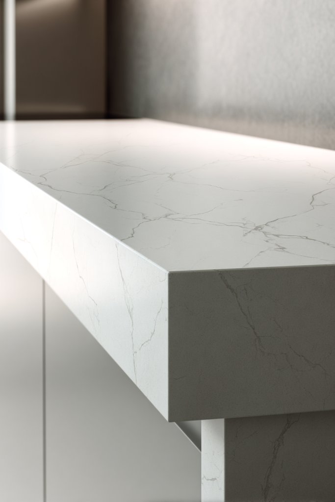 Select high-quality quartz with a subtle veining pattern that complements your overall color scheme. When measuring, allow for a slight overhang to create a sleek edge profile—such as eased or mitered edges—that enhances the minimalist aesthetic. Quartz is durable and low-maintenance, making it ideal for busy kitchens. Installation should be handled professionally to ensure seamless joints and a flawless surface. Regular cleaning with gentle soap and water keeps the veining looking sharp and pristine.