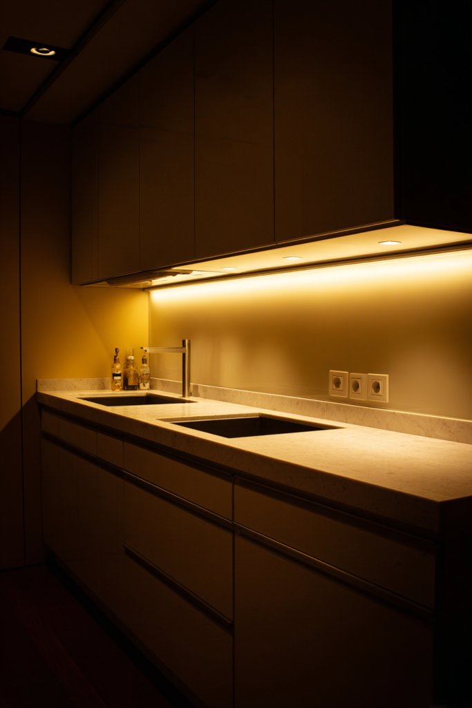 3. Under-Cabinet LED Lighting to Highlight Workspaces and Create Ambient Glow