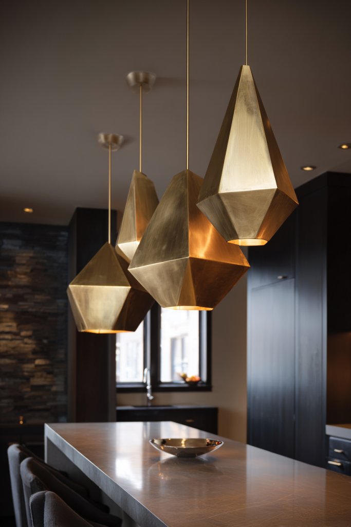 5. Statement Pendant Lights with Geometric Shapes in Metallic Finishes