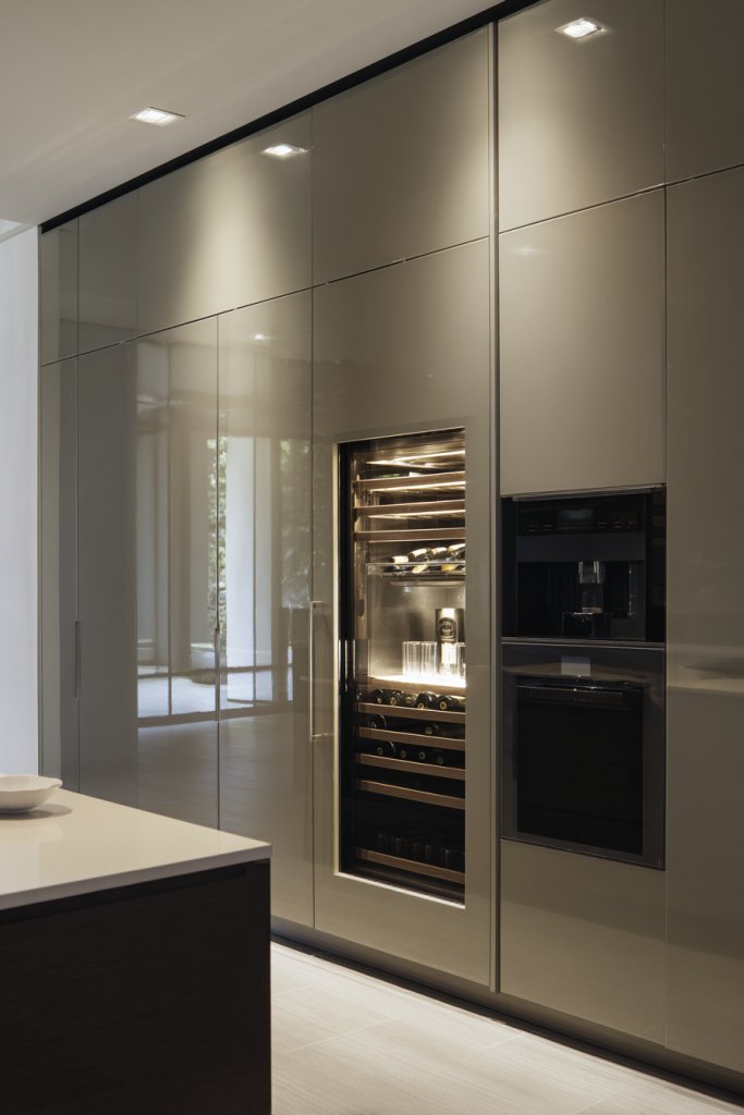 Visualize a sleek, integrated unit seamlessly built into your cabinetry, with glass doors showcasing chilled bottles and sparkling drinks. The soft glow of LED lighting inside highlights your collection, turning storage into display. The surrounding cabinetry matches the rest of the kitchen, creating a cohesive, high-end look. It’s like having a private bar right at home.