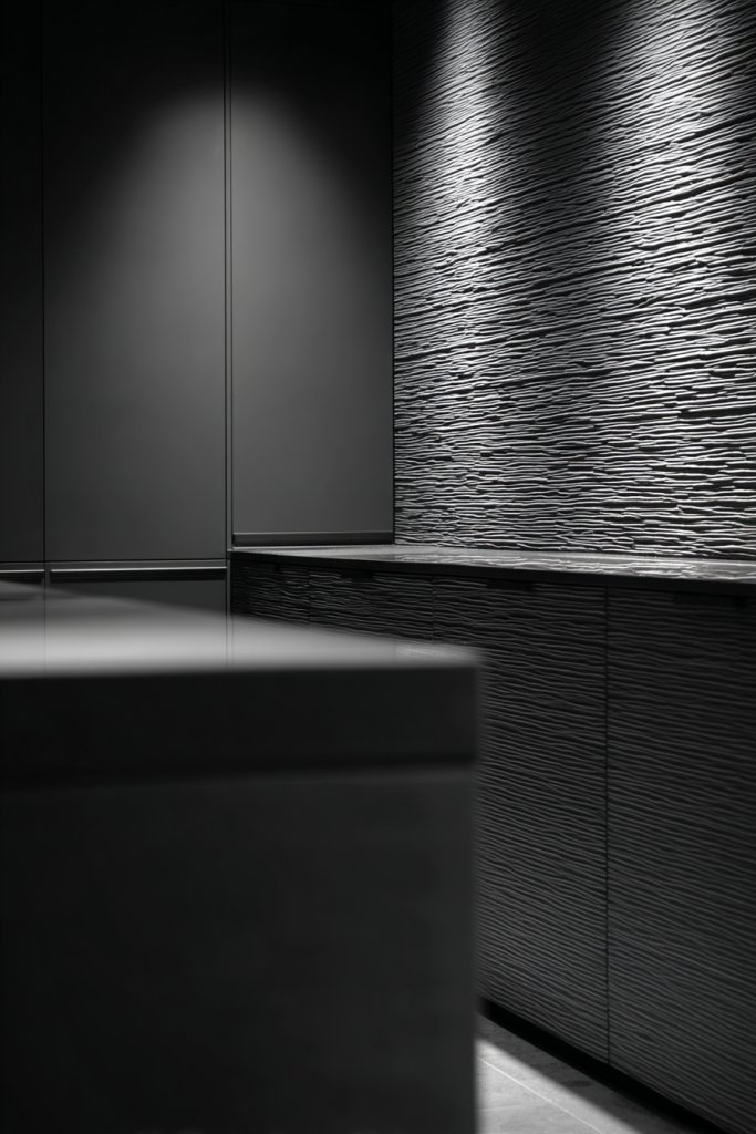 Envision walls clad in textured panels—think 3D geometric patterns, ribbed surfaces, or embossed tiles—in shades of your chosen monochrome hue. Pair these with matte or satin finishes on cabinets and countertops for a layered look. The textured wall softly catches light, creating shadows and highlights that change throughout the day. The overall effect is sleek, sophisticated, and full of visual interest.