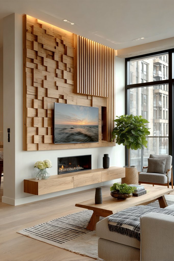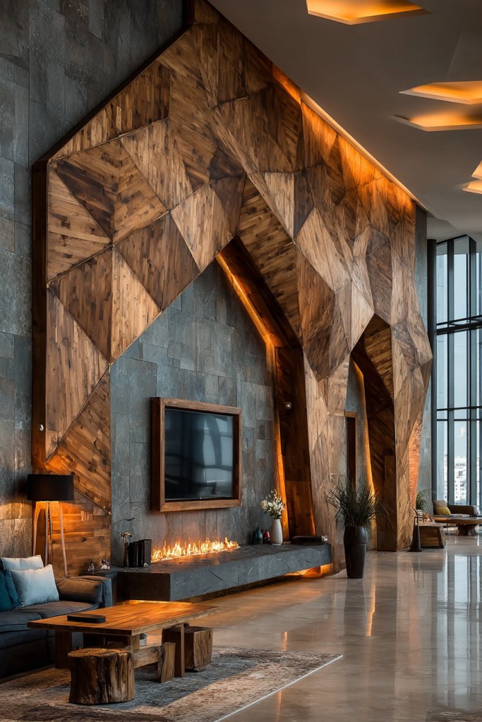 19. Geometric Wooden Wall Art with Built-In TV Space