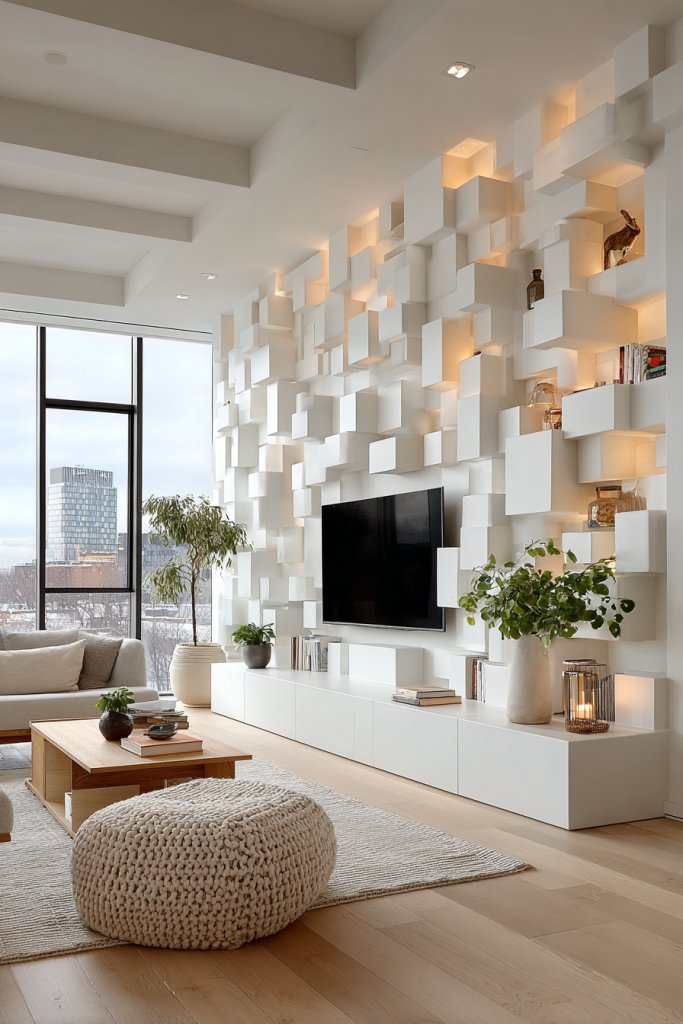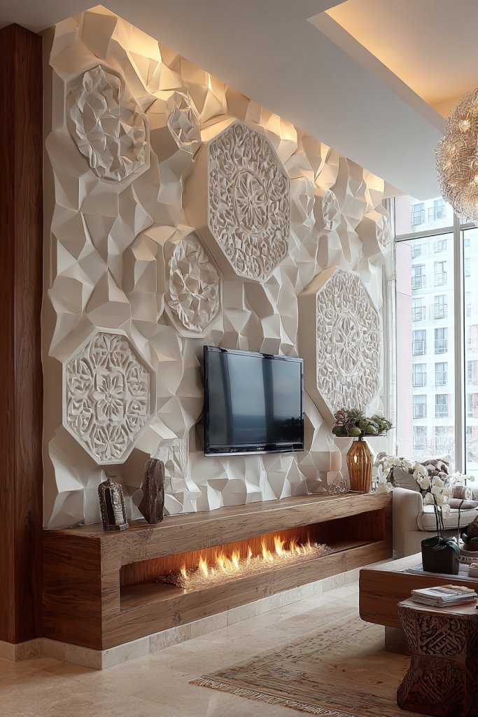 Picture a wall covered in geometric or organic 3D panels that play with light and shadow. The textured surfaces create a sense of movement, making the space feel lively and multidimensional. The panels come in a variety of finishes—matte, gloss, or metallic—that catch the light differently throughout the day. The TV is mounted flush or slightly inset into the textured backdrop, enhancing the visual impact.