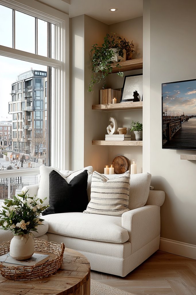 Decorate the shelves with artistic objects or functional items like small speakers or storage boxes. Use lighting—such as strip LEDs or puck lights—to highlight the shelves and create ambiance. Incorporate textiles like cushions or throws nearby for comfort. Periodically rearrange the items to keep the setup fresh.