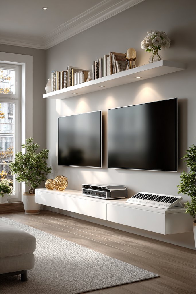 A dual-monitor wall setup boosts productivity and entertainment in one stylish package. It’s a modern, efficient use of space that adapts to your tech needs. Once in place, it transforms your living room into a high-functioning hub that impresses friends and supports your lifestyle. Ready to elevate your multi-tasking game?