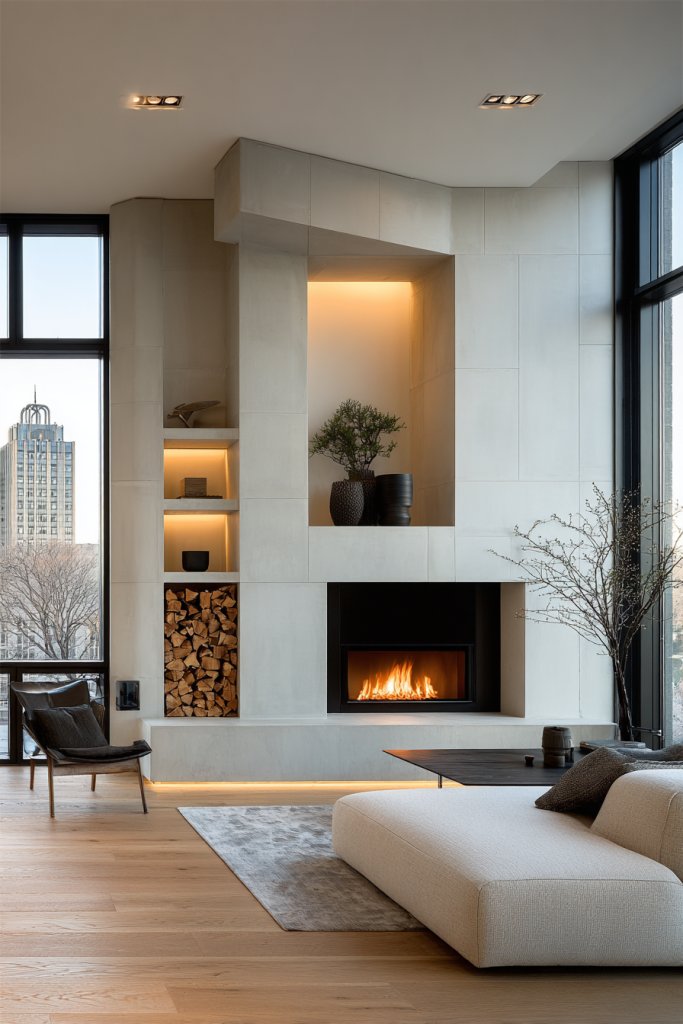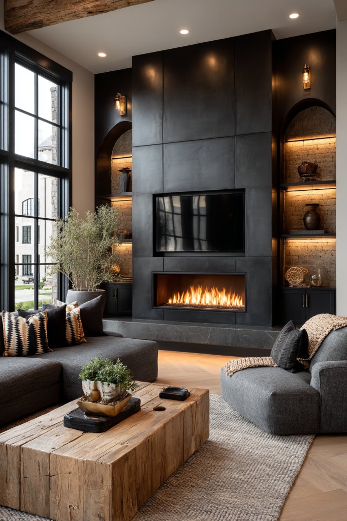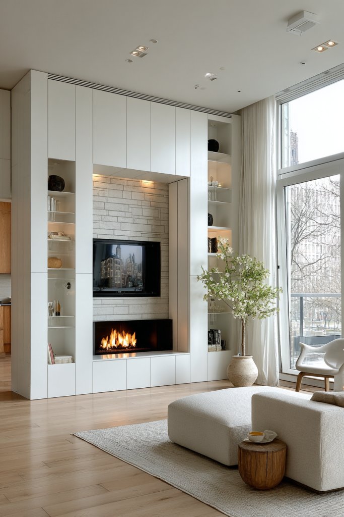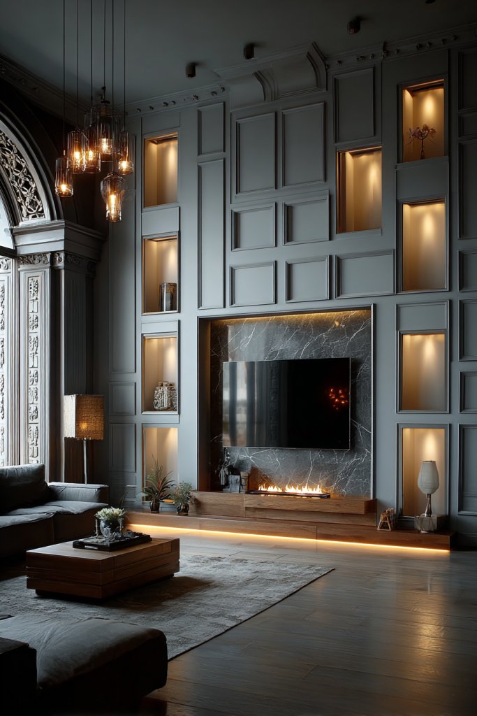 Want your living room to feel balanced and elegant? Symmetrical wall paneling with recessed lighting creates a harmonious, high-end look that emphasizes order and sophistication. It’s perfect for those who appreciate classic design with a modern twist. If your space feels uneven or cluttered, this idea provides a refined solution.