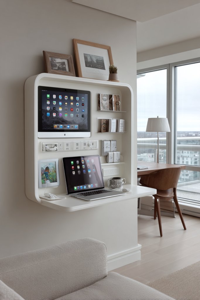 Opt for shelves with multiple charging ports or modular units that can be customized for your device arsenal. Use different materials—wood, glass, or metal—to match your decor style. Incorporate small drawers or compartments for accessories like headphones or cables. This setup is adaptable for various room sizes and can be combined with other storage solutions.