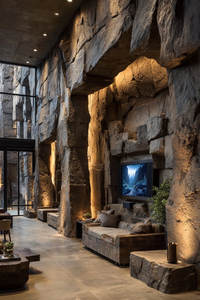 Visualize a large wall clad in natural stone or high-quality faux panels that mimic real stone textures. The rough surface contrasts beautifully with sleek, modern furniture. The TV is mounted flush against the stone, creating a seamless, earthy backdrop. Ambient lighting from above or below enhances the stone’s natural beauty, creating a warm, inviting glow.