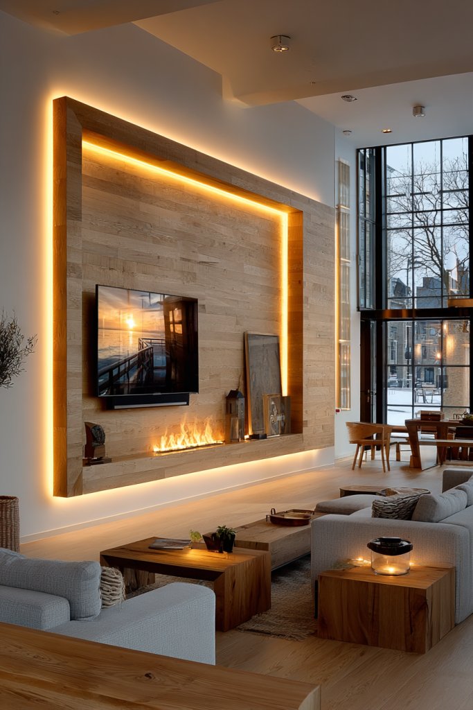 Looking for a cozy, minimalist vibe that feels fresh and inviting? A Scandinavian-style light frame around your TV adds a soft glow and clean lines that brighten your living room. It’s perfect for creating a relaxing atmosphere with a touch of elegance. If your space feels dark or cluttered, this idea offers a simple yet effective refresh.