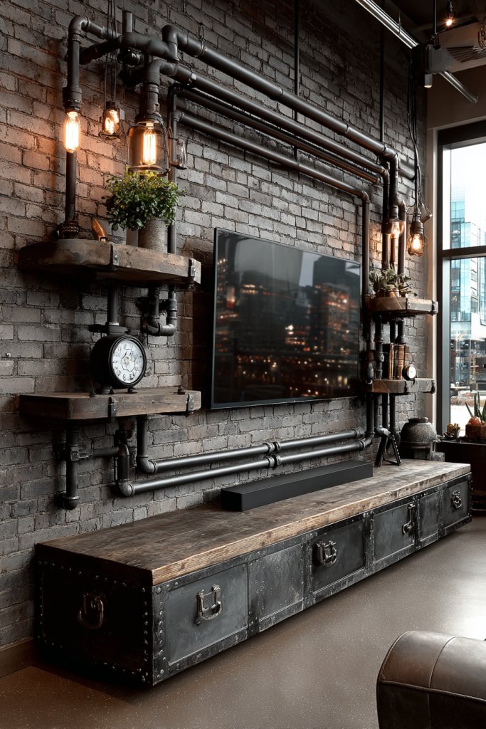 Craving an edgy, urban look that’s both functional and stylish? Industrial pipe shelving with a mounted TV combines raw metal with practical storage, creating a standout feature wall. It’s ideal for lofts, man caves, or anyone wanting a modern-industrial vibe. If your current setup is too polished or generic, this idea adds attitude and character.