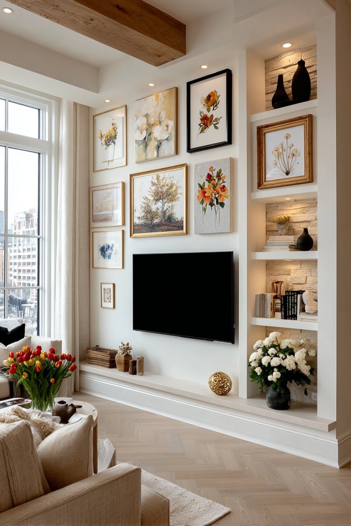 A gallery wall surrounding your TV turns a simple entertainment unit into a reflection of your personal style. It’s a great way to showcase your taste and make the space uniquely yours. Plus, it’s easy to update—swap out prints or add new pieces whenever inspiration strikes. Your living room will feel more vibrant and inviting in no time!