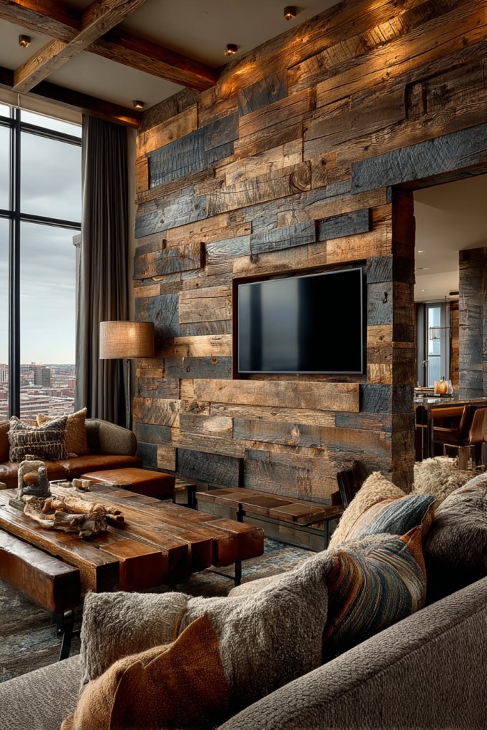 Picture a wall clad in weathered, stained wood planks that stretch from floor to ceiling. The rich grain and knots add character, making the space feel grounded and organic. The textured wood contrasts beautifully with smooth, painted walls or sleek furniture. The TV sits seamlessly in the center, framed by the warmth of the wood, creating a focal point that exudes comfort.