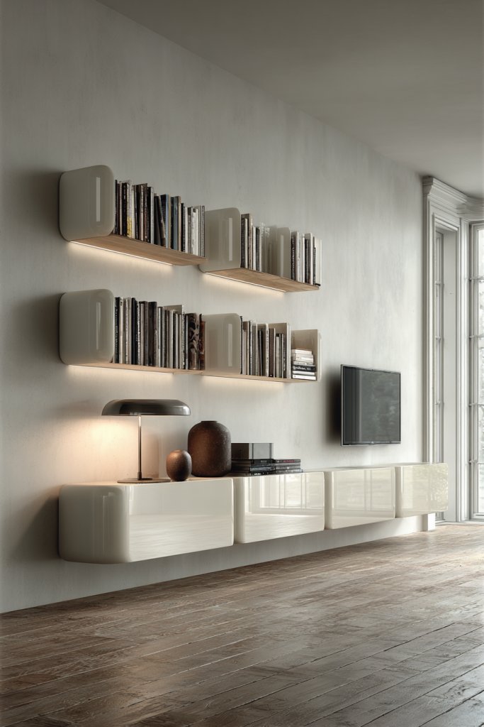 Use curved or L-shaped shelves for a softer, more inviting look. Mix open shelving with closed cabinets for storage flexibility. Choose materials like wood, metal, or glass depending on your decor theme. This setup adapts well to small apartments, open-plan spaces, or rooms with limited wall space elsewhere.