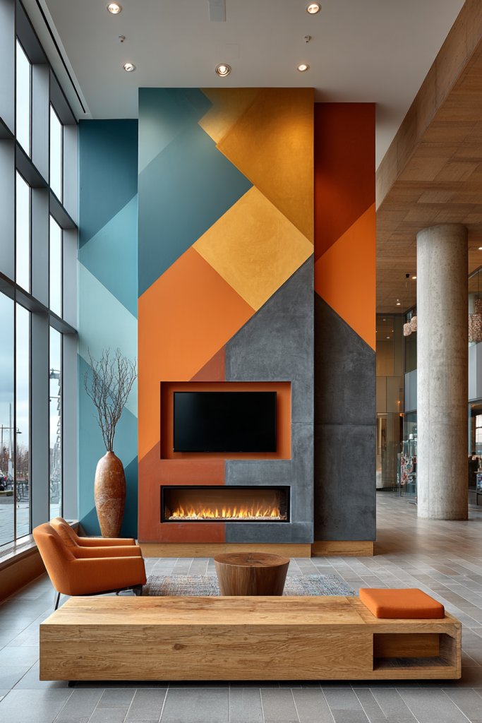Picture a wall painted in two or three contrasting or harmonious colors, split horizontally, vertically, or diagonally. The bold colors create a dynamic backdrop that makes your TV pop. The textures and finishes can vary from matte to gloss, adding depth. The rest of the room features neutral furniture to keep the focus balanced, resulting in a lively yet cohesive aesthetic.