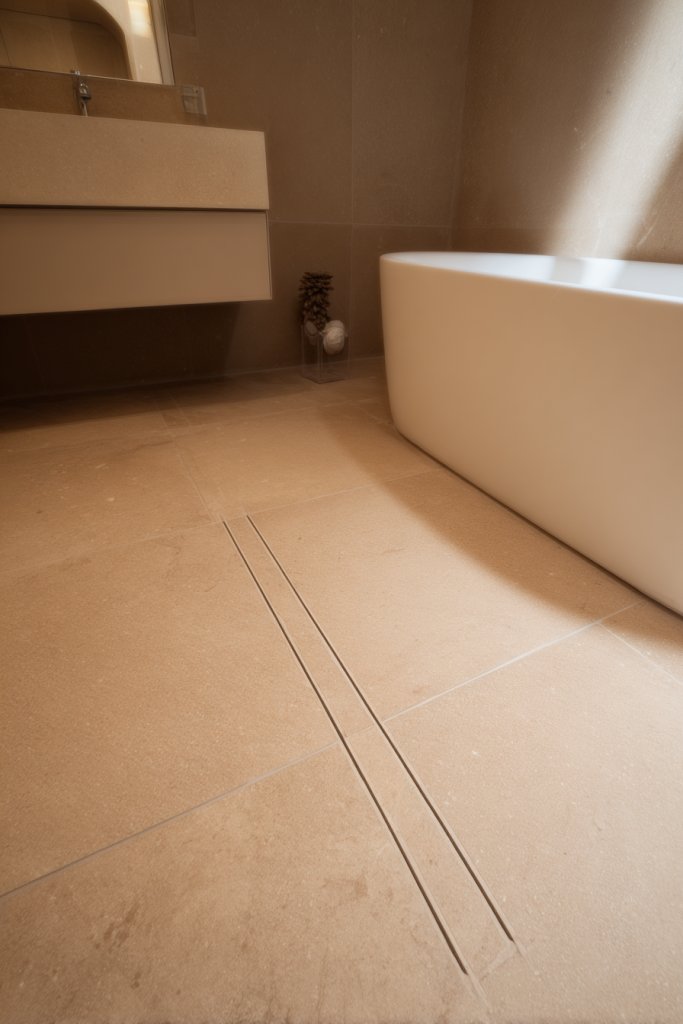Visualize a shower floor with a nearly invisible linear drain that runs along one edge, covered with matching tiles. The surface appears uninterrupted, with water flowing effortlessly into the concealed system. The minimal gap allows for easy cleaning and prevents debris buildup. The overall effect is a polished, high-end look that’s both functional and beautiful.