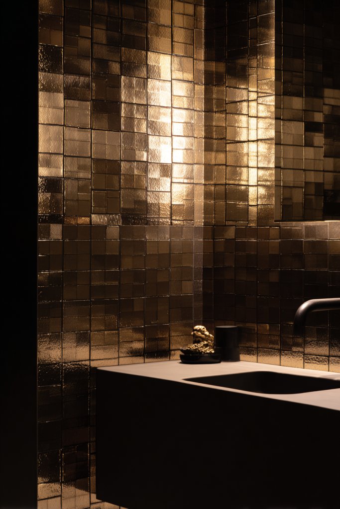 Imagine a wall covered in shimmering, metallic tiles or high-gloss paint that reflects light and adds a luminous quality. The reflective surfaces create depth, bouncing ambient light around the room. Paired with matte fixtures and neutral tones, the glossy wall becomes a striking focal point that exudes style and confidence.