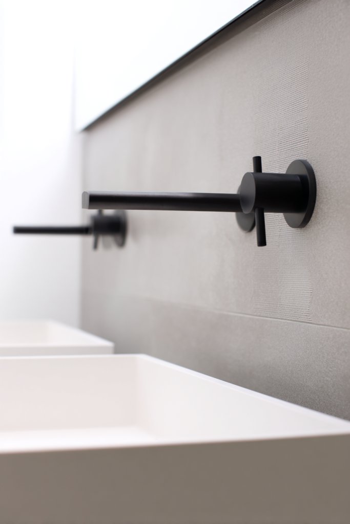 Picture a wall with a thin, matte black faucet hovering over a smooth stone sink. The clean, geometric lines draw your eye, emphasizing the simplicity of the design. The fixtures blend seamlessly into the wall, giving the illusion that they are floating. The overall effect is a spa-like, uncluttered aesthetic that instantly feels more upscale.