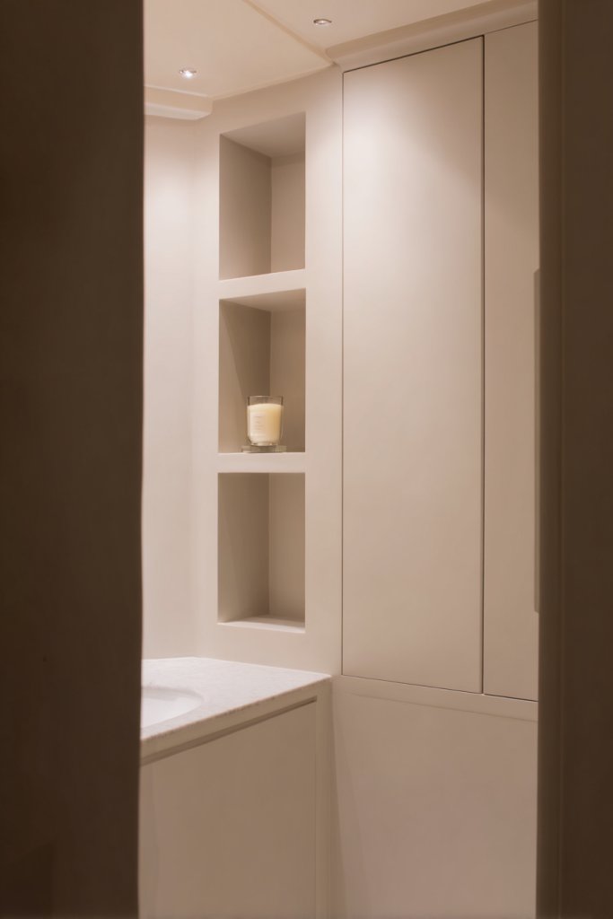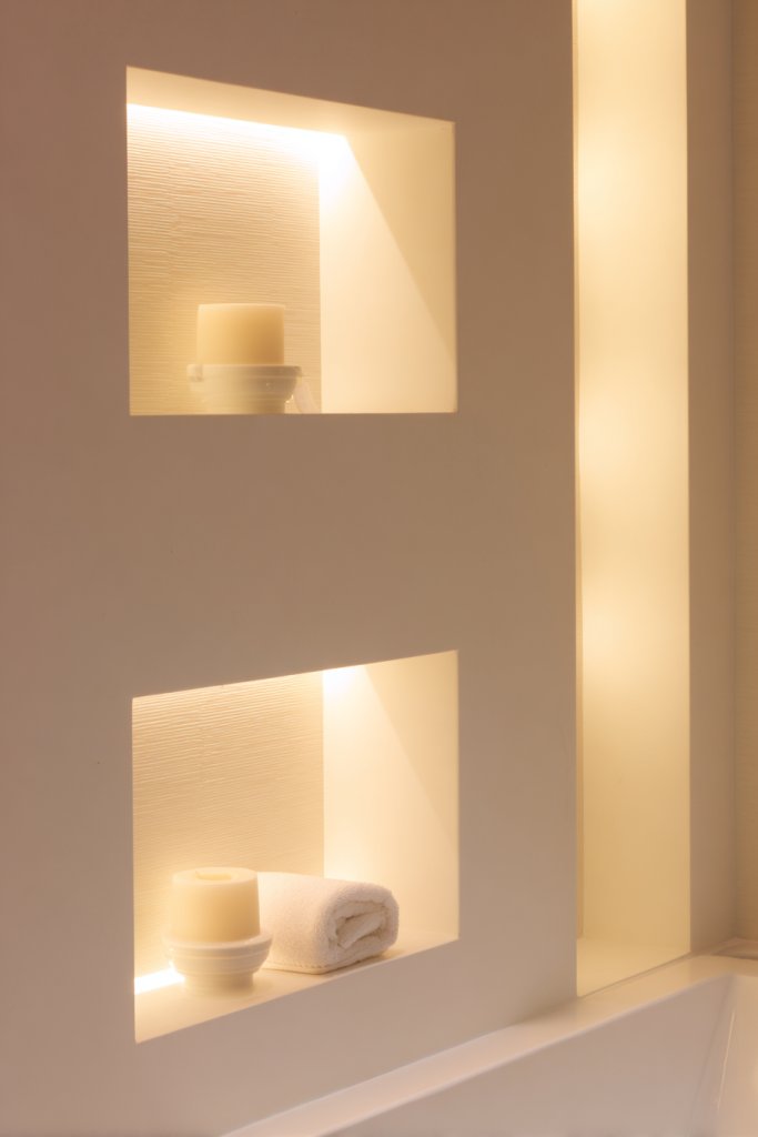 Picture a set of open, built-in shelves set into the wall with soft, warm LED strips illuminating your favorite skincare or decorative items. The shelves are flush with the wall, blending seamlessly into the overall design. The light subtly highlights the textures of your chosen materials, whether wood, stone, or tile. It creates a layered, sophisticated look that feels both modern and cozy.