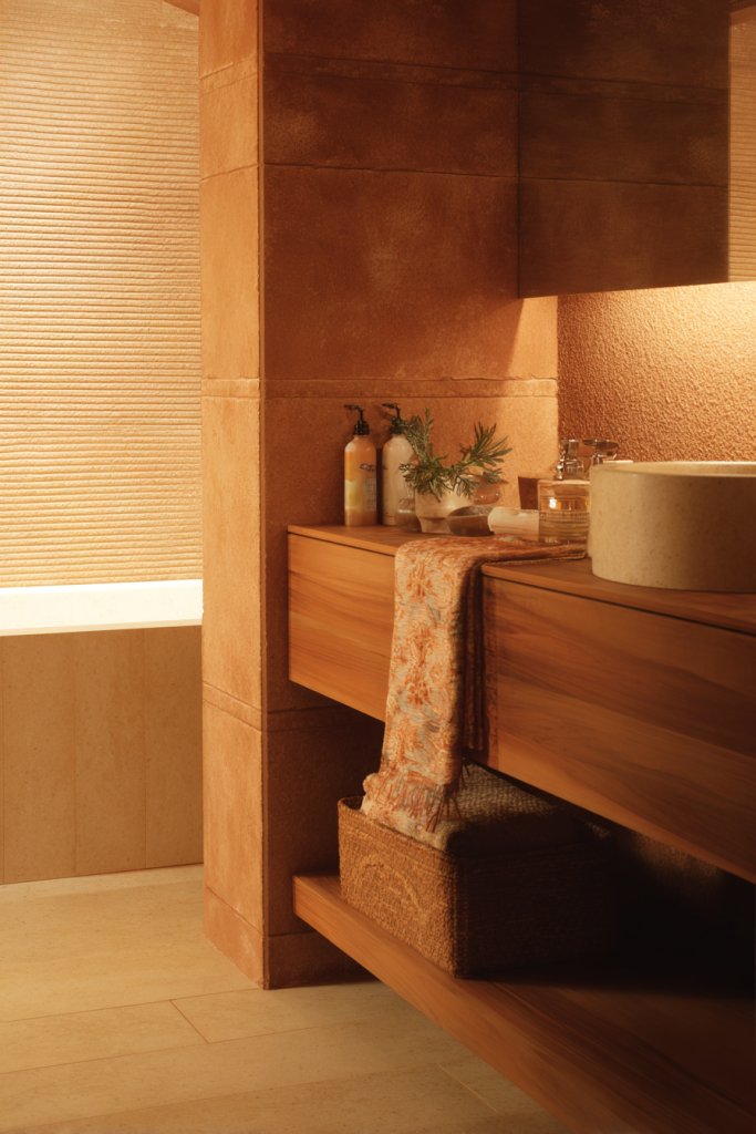 Envision a bathroom where all surfaces are in shades of soft gray or warm beige. Textured wall panels with gentle ridges or geometric patterns create a tactile experience that catches the light differently throughout the day. The uniform color palette highlights the texture, making the walls feel alive and dynamic. Minimalist fixtures and sleek accessories complete this refined aesthetic.