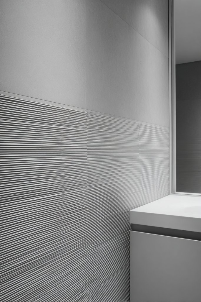 Imagine a wall covered in vertically arranged tiles with ridges, waves, or geometric patterns in muted tones. The texture plays with light, casting subtle shadows that add visual interest. The uncluttered design complements modern fixtures and minimal decor, creating a sophisticated, layered look. The tactile quality invites touch and curiosity.