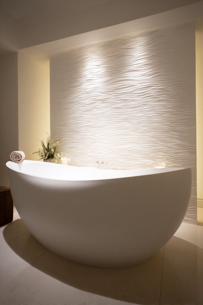 Layer in plush, textured towels, and a soft rug nearby for comfort. Use scented candles or essential oil diffusers to create a calming ambiance. Add a sculptural side table or a sleek stool for bath essentials. You could also incorporate a textured wall or decorative panel behind for extra visual interest.