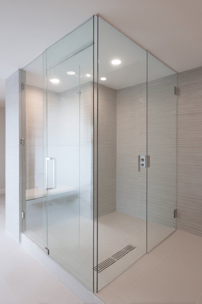 Visualize a clear glass panel stretching from floor to ceiling, with barely-there hardware holding it in place. The transparency showcases beautiful tile work and a minimalist design aesthetic. Light flows freely, bouncing off shiny fixtures and textured wall surfaces, creating a bright, airy vibe. The glass reflects your style, whether modern, industrial, or Zen.