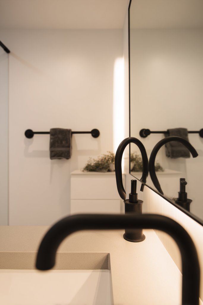 Imagine matte black faucet handles, towel bars, and shower fixtures contrasting sharply with crisp white walls or soft-toned tiles. The dark accents ground the space, adding depth and visual interest. The matte finish reduces glare, creating a muted, luxurious feel. Small details like black cabinet pulls or soap dishes can tie the look together seamlessly.