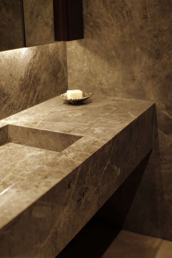 Visualize a spacious vanity topped with a polished marble slab featuring subtle veining in shades of gray or beige. The surface catches and reflects light, adding depth and sophistication. Paired with matte black fixtures and minimalist cabinetry, the natural stone becomes the star of the room. The textures and patterns create a tactile, inviting environment.