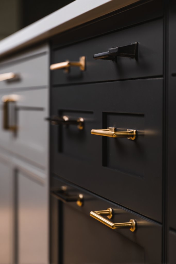 Imagine matte black handles with a soft, velvety finish or brushed gold pulls that catch the light. These fixtures stand out against neutral cabinets, adding depth and a high-end feel. The matte black creates a modern, edgy vibe, while brushed gold exudes warmth and elegance. Together, they frame your cabinetry beautifully, tying the room’s elements into a cohesive look.