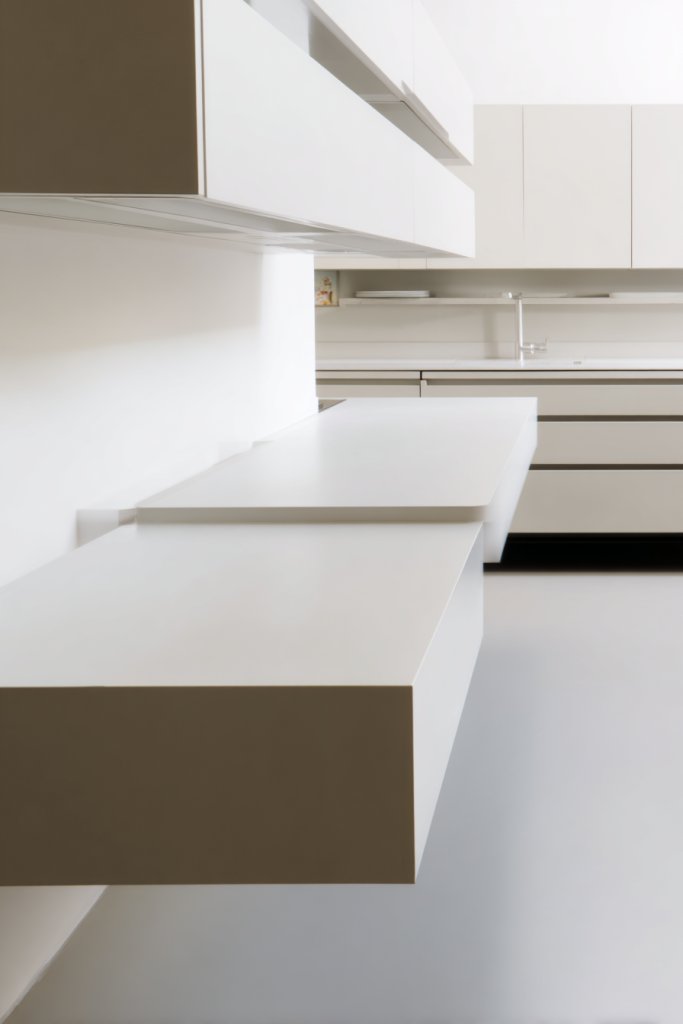 Imagine a countertop that appears to hover above the cabinetry, supported by hidden brackets or structural supports. The clean lines and lack of visible hardware give the illusion of more space, especially in small or open-concept kitchens. The smooth surface reflects light beautifully, enhancing the sense of openness and simplicity. Minimalist fixtures and under-cabinet lighting complete the look.