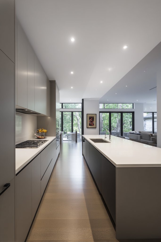 Imagine walls of glass that stretch from floor to ceiling, offering panoramic views of your garden or cityscape. Sunlight filters through, bouncing off polished countertops and gleaming hardware, creating a bright, vibrant environment. Skylights add a touch of drama, casting natural patterns on your floors and walls. The space feels more connected, peaceful, and full of life.