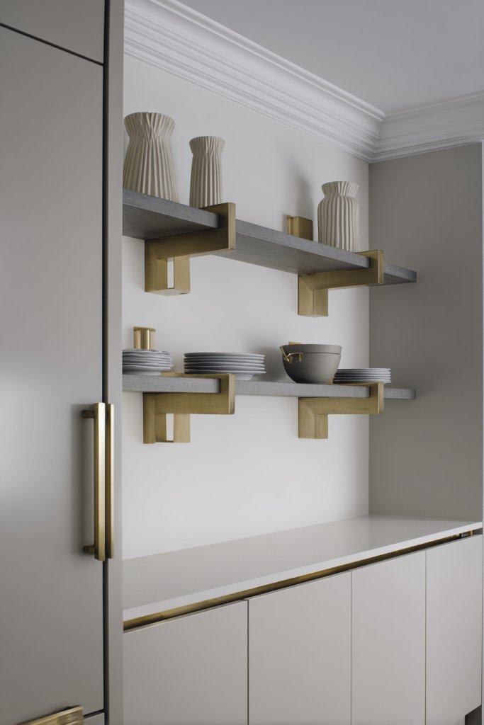5. Custom-built, open shelving with metallic accents for stylish storage solutions