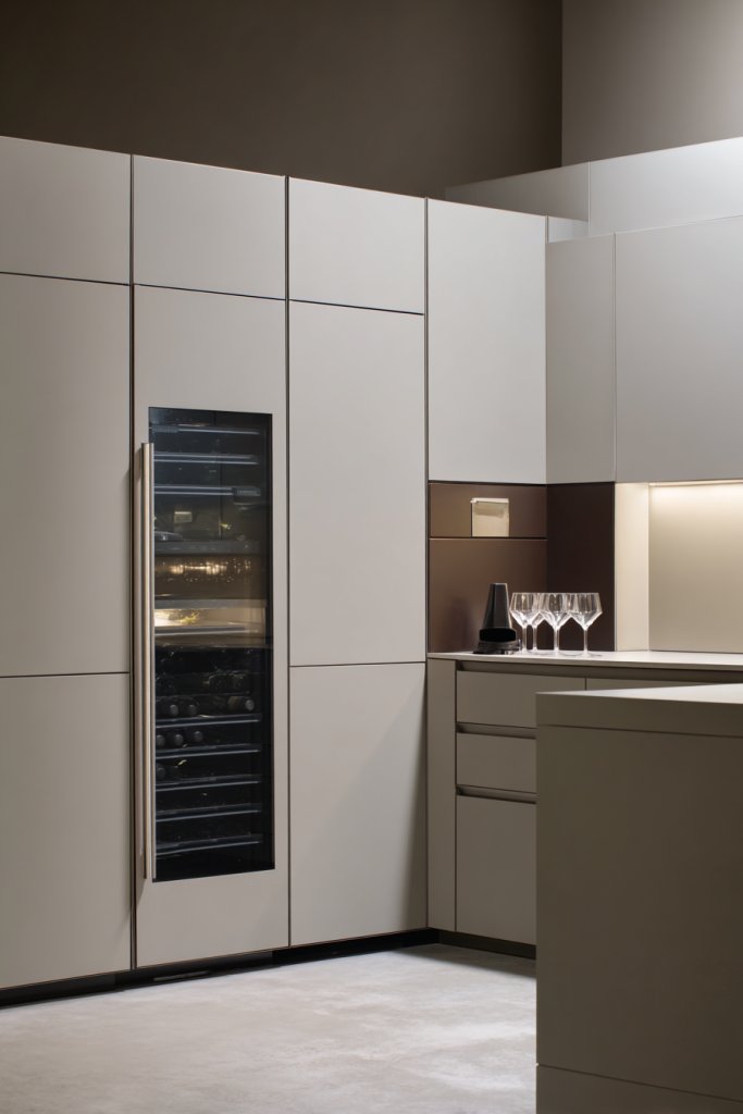 Picture a sleek, integrated wine cooler built into your cabinetry, with glass doors revealing perfectly stored bottles. Adjacent, a stylish beverage station with a small fridge, dedicated glassware, and a display shelf creates a mini bar feel. The setup blends seamlessly into your kitchen, with lighting accents highlighting bottles or glassware. It’s the perfect combo of function and style, ready for your next celebration.